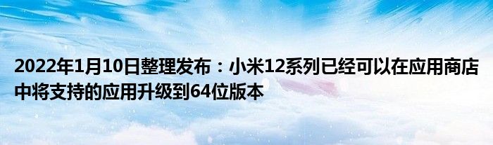 2022年1月10日整理发布:小米12系列产品经理@Cici_老魏今日在微博表示,小米12系列已经可以在应用商店中将支持的应用升级到64位版本,应用名称后会有标注“64位版本”。