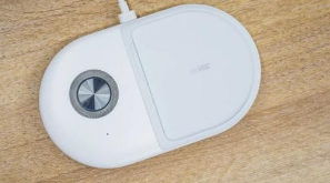 AirVOOC无线充电板具有椭圆形的外形,并带有白色和灰色亮点。顶部有一个凹槽,中间带有标记“ AirVOOC”。在这里,您可以保留手机以进行无线充电。左侧有一个大的银色按钮,其下方有一个LED指示灯。