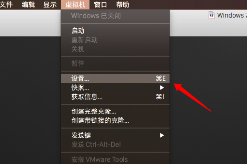 1、打开VMware,确保虚拟机的win7系统处于关闭状态,点击左上角的“虚拟机”——“设置”,如图所示: