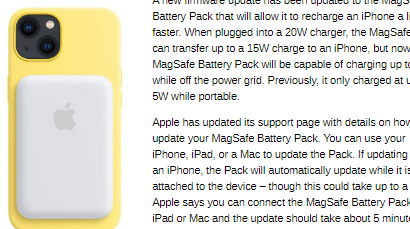 MagSafe电池组已经更新了新的固件更新,这将允许它更快地为iPhone充电。当插入20W充电器时,MagSafe电池组可以向iPhone传输高达15W的电量,但现在,MagSafe电池组将能够在断开电网的情况下充电高达7.5W。以前,它在便携时只能充电至5W。