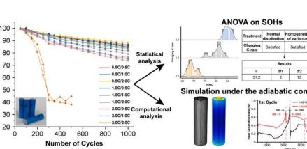 这项研究是针对最常用的锂二次电池之一的圆柱形电池(2.85Ah)进行的。研究小组分析了从各种C率条件下的1,000多次测试中获得的大约170万个时间序列数据。他们在世界上首次提供了C率对锂离子电池循环寿命和发热影响的统计分析,因为之前的研究只是提供了充电和放电容量随循环的变化。
