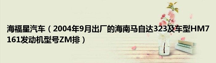 1,2004年9月出厂的海南马自达323 车型HM7161发动机型号ZM排:海南马自达是合资汽车公司,生产323车型,2006年12月合资公司合同到期,解散之后成立国产汽车公司:海马汽车。马自达二代是半合资型的,海南马自达323车型号,发动机马自达的,省油。04年九月的如果没什么大毛病,发动机没修过的话,没出过事故,可以过户,包牌价卖的话应该在5万左右 ,它的下一代就是福美来,后来有福美来二代,现在还有海福星,不过,后来的都是国产的。