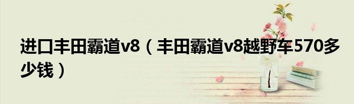 1,丰田霸道v8越野车570多少钱 :霸道系列都是v6发动机,酷路泽4600,5700是v8发动机。目前霸道报价大概在37~55,价格不断变化,了解平行进口车实时报价信息尽在进口车市