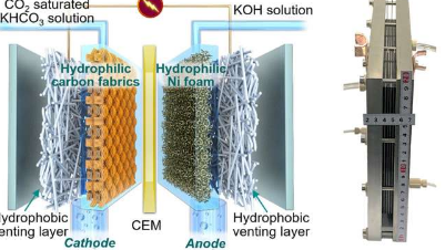 研究人员开发的电解槽具有新的电极和一种新型的液体电解质,这种电解质被CO2饱和,并流过设备,通过电化学反应转化为CO。