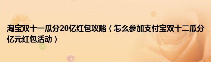 大家好,今天小悦来为大家解答以上问题。淘宝双十一瓜分20亿红包攻略,怎么参加支付宝双十二瓜分亿元红包活动很多人还不知道,现在让我们一起来看看吧!