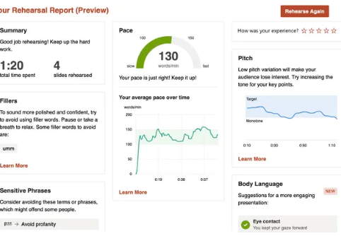 随着可用性的扩展,该功能还尝试了一些新方法来使您的演示文稿更好:它可以查看肢体语言(如果您与目光接触或将物体放在前面,则距相机有多近) ),并在重复单词或说错单词时向您发出警告。是的,它仍然告诉您不要在演示文稿中起誓。