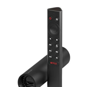 流媒体摇杆带有一个三角形设计的遥控器。遥控器具有电源按钮,菜单按钮,播放控件,音量控件,麦克风和主页按钮,以及专用的Netflix按钮。