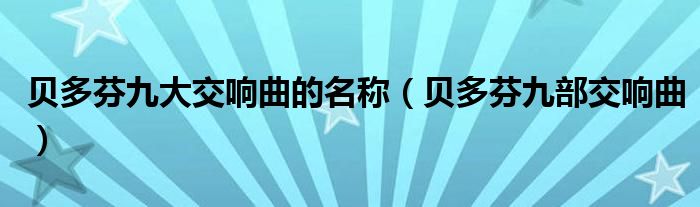 1、一、C大调《第一交响曲》二、D大调《第二交响曲》也被阿贝称作“英雄的谎言”三、降E大调《英雄》四、降B大调《第四交响曲》五、C小调《命运》六、F大调《田园》七、A大调《第七交响曲》八、F大调《第八交响曲》九、d小调《合唱》也称作《欢乐颂》,因为阿贝将《欢乐颂》用合唱的形式写进了《第九交响曲》的第四乐章。